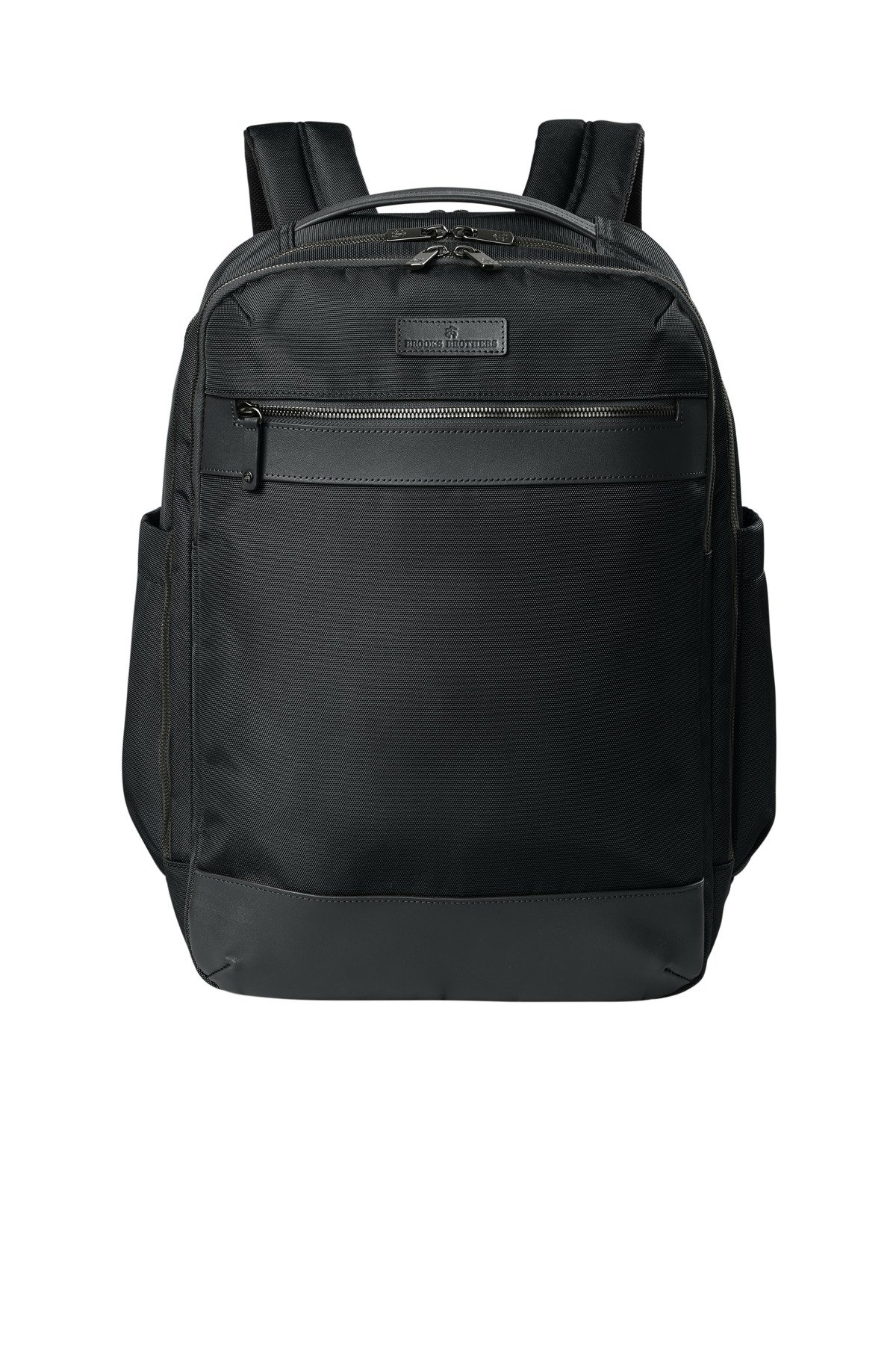 500D x 750D polyester, knitted fabric backing 420D polyester lining Genuine leather trim and details Front zippered pocket with leather pull for decoration access Zippered main compartment with interior zip mesh pocket and slip pocket Dedicated back padded laptop compartment Zippered front compartment with office Side pockets with elastic gussets Ergonomic, padded and adjustable shoulder straps Padded mesh back Leather feet at base Metal zipper pulls with Brooks Brothers logo Exterior debossed leather label Trolley pass through with concealed zippered pocket Laptop compartment: 15.75″h x 11.5″w; fits most 17″ laptops Dimensions: 17″h x 11.5″w x 7″d Capacity: 1,526 cu. in./25 L Weight: 2.7 lbs./1.23 kg Note: Bags not intended for use by children 12 and under.