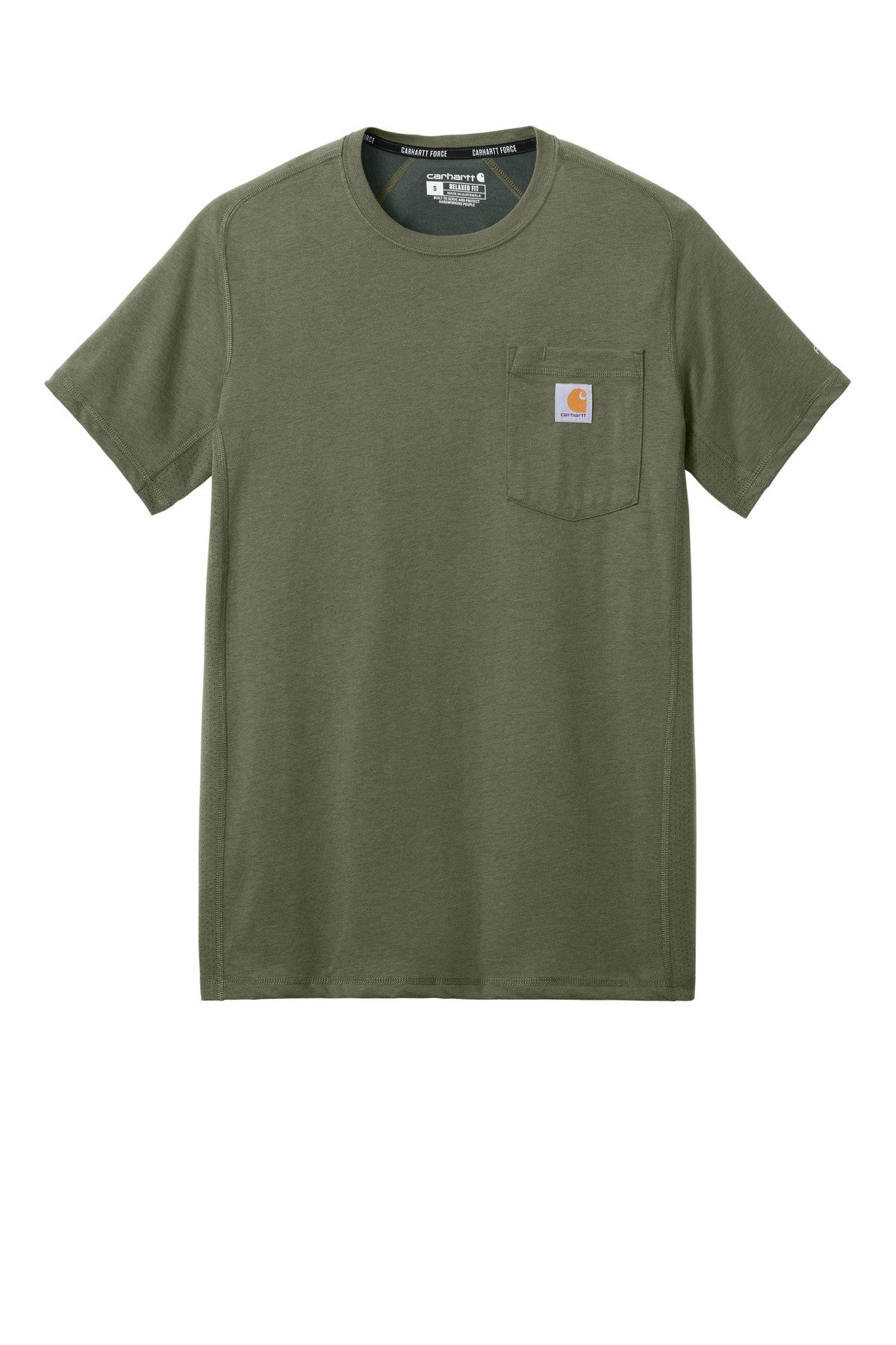 This midweight pocket tee fights sweat and is built for hard work thanks to Carhartt Force technology. Durable 5.75-ounce, 65/35 cotton/poly stretch plaited jersey knit 59/41 cotton/poly stretch plaited jersey knit (Heather Grey) 60/40 poly/cotton stretch plaited jersey knit (Other Heathers) Carhartt Force technology wicks sweat, dries fast and fights odors FastDry technology keeps you cool for all-day comfort UPF 25+ Raglan sleeves to increase range of motion Left chest pocket with pen stall Tagless neck label Smooth flatlock seams Ventilated side panels Drop tail hem Carhartt label sewn on left chest pocket Carhartt Force labeling on left sleeve Relaxed fit