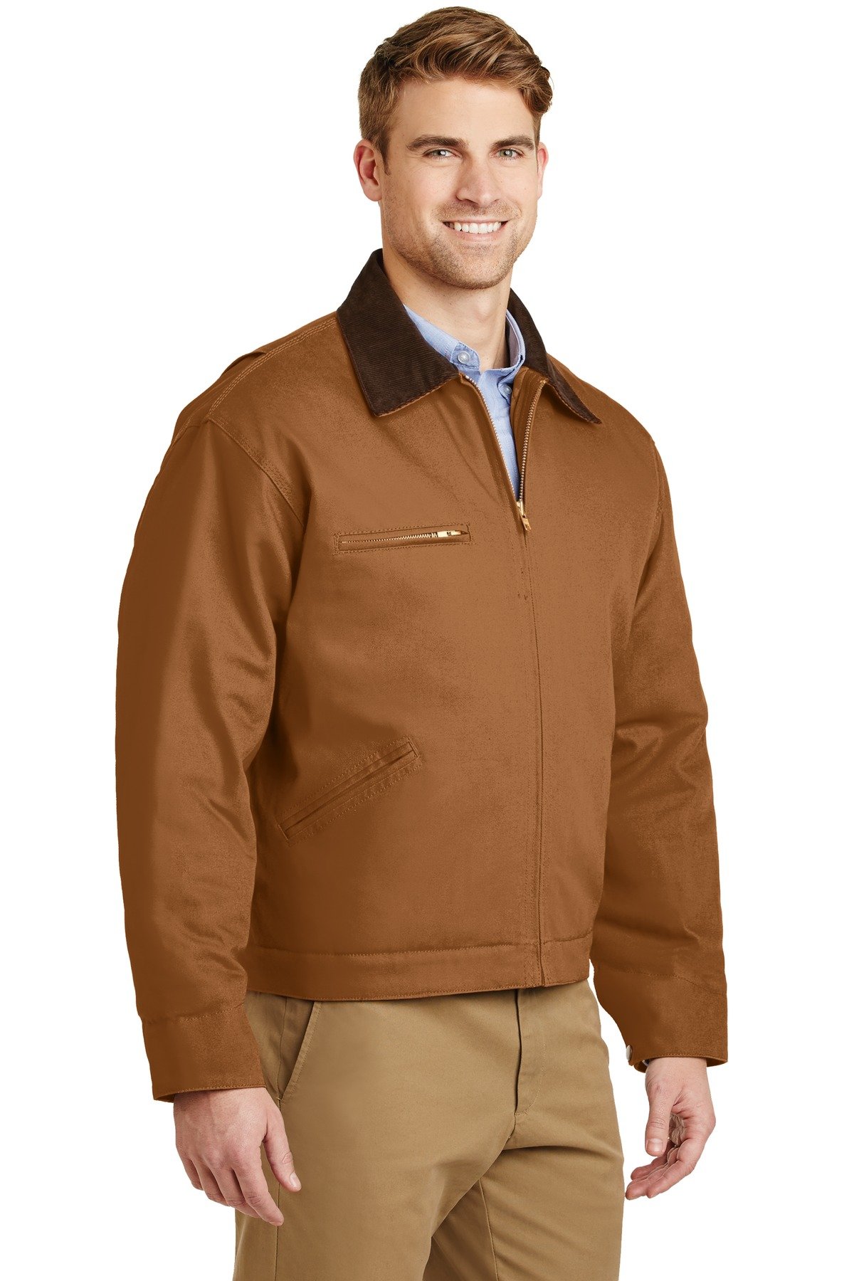A workwear staple, this jacket has triple-needle stitching at the shoulders and armholes so it will last job after job. 12-ounce, 100% cotton duck cloth 6-ounce polyfill nylon dyed-to-match lining Corduroy collar Bi-swing back Zippered chest pocket Adjustable 2-snap sleeves Front slash pockets Adjustable button waist tabs Decoration access pocket