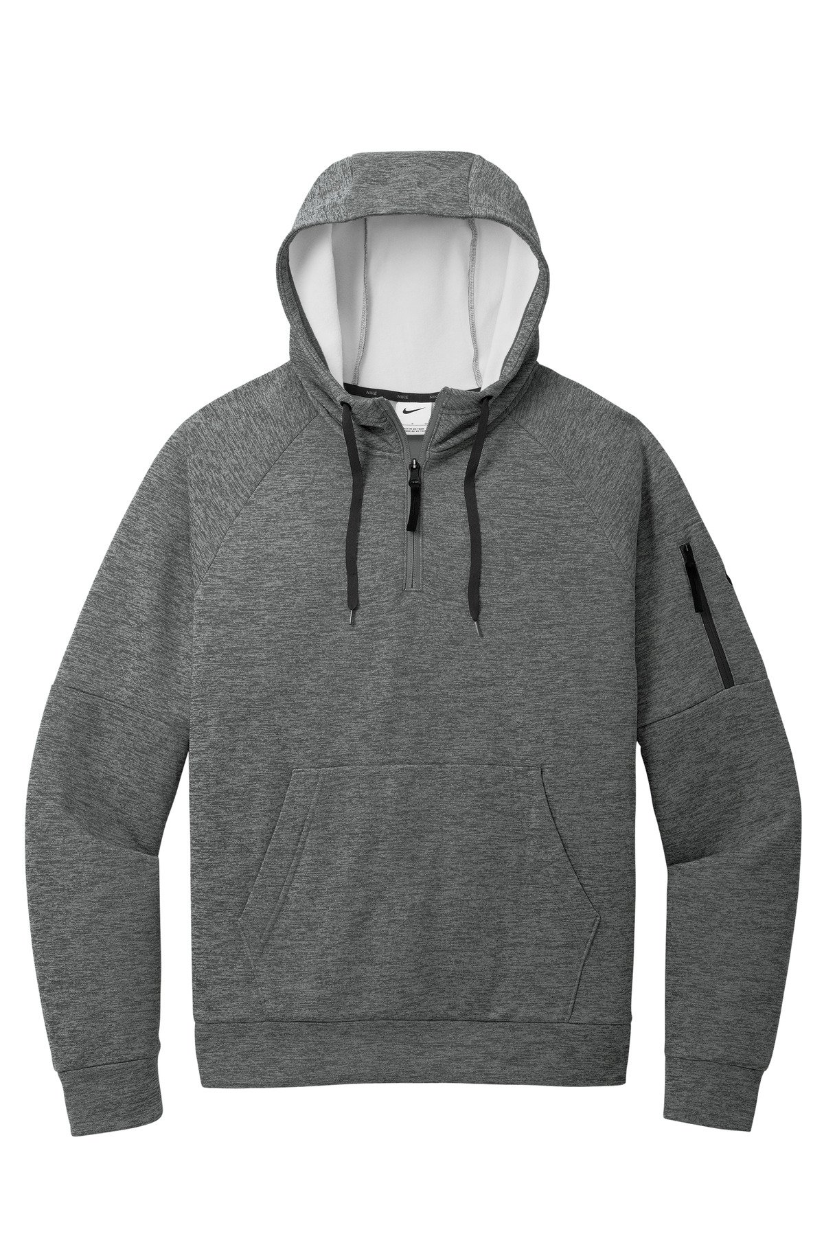 This 1/4-zip hoodie with a zippered left arm pocket brings the heat to your workout with Therma-FIT fabric Therma-FIT helps manage your body’s natural heat to keep warm in cold-weather conditions The design includes a three-panel hood with black drawcords, a dyed-to-match zipper and a front pouch pocket Self-fabric cuffs and hem A contrast Swoosh logo is embroidered on left sleeve A contrast Therma-FIT logo is embroidered on back hem Made of 7.4-ounce polyester Therma-FIT fabric with at least 50% recycled content.