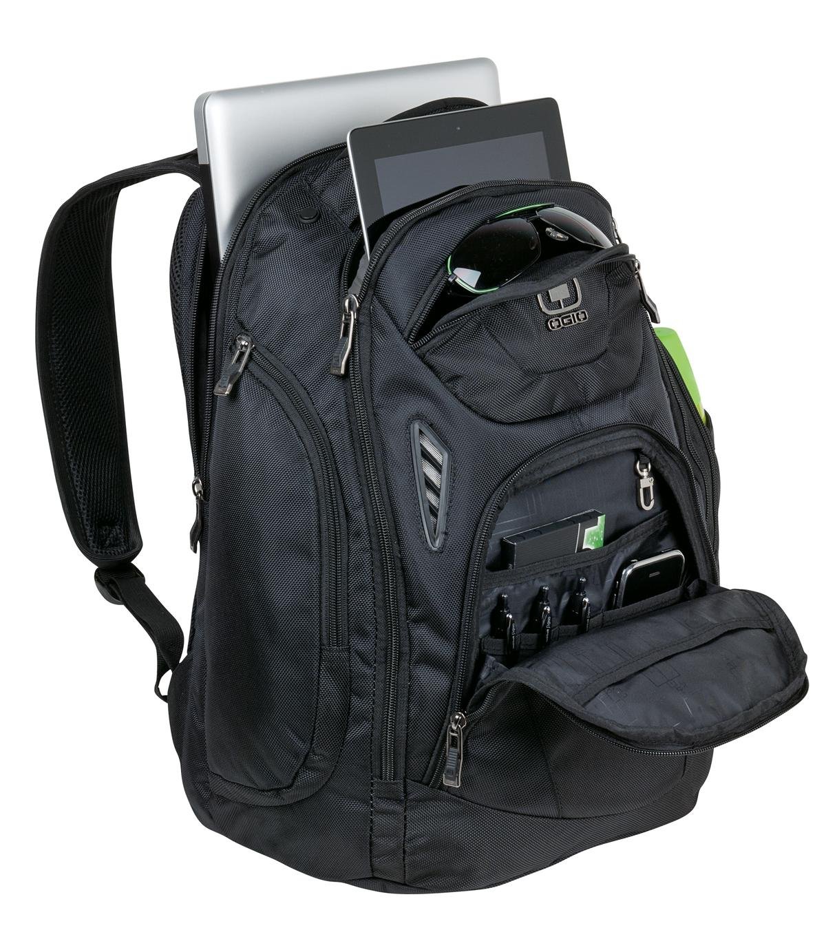 An ultra-protective pack that keeps your pricey gadgets in pristine condition. 1,680D poly/900D poly Front compartment with file divider Back padded laptop pocket Padded tablet/e-reader sleeve Organization pocket Fleece-lined pocket for digital media/audio or valuables Two side zippered pockets Side mesh beverage pocket Comfortable straps with elastic shock absorbers, sunglass loop and elastic pocket Ultra-padded air mesh back panel with ventilation channels Laptop sleeve: 15.5″h x 11.5″w x 1.5″d; fits most 17″ laptops Dimensions: 19″h x 13.5″w x 8.5″d Capacity: 1,584 cu. in./25.9 L Weight: 2.6 lbs./1.18 kg Note: Bags not intended for use by children 12 and under. Includes a California Prop 65 and social responsibility hangtag.