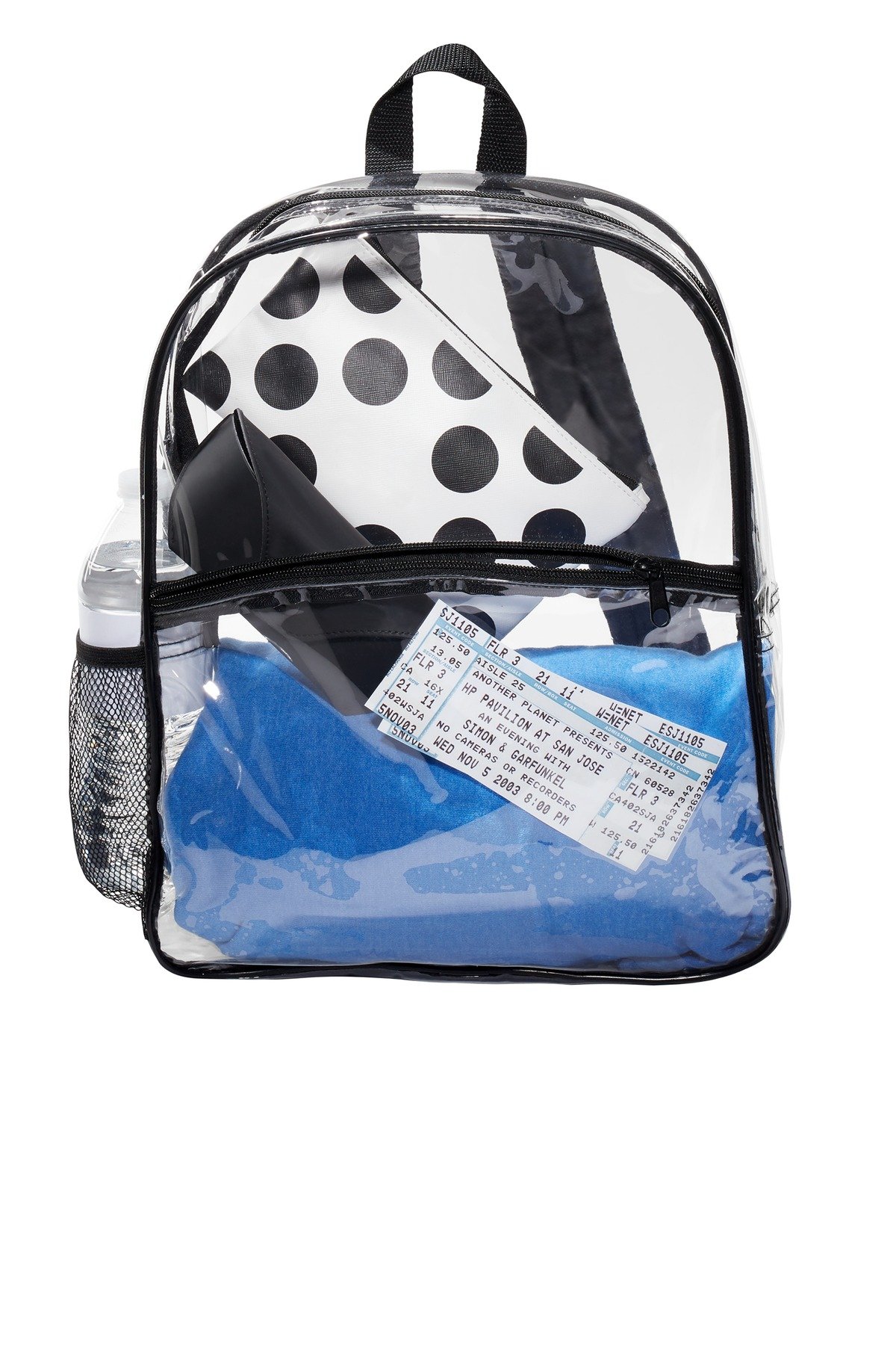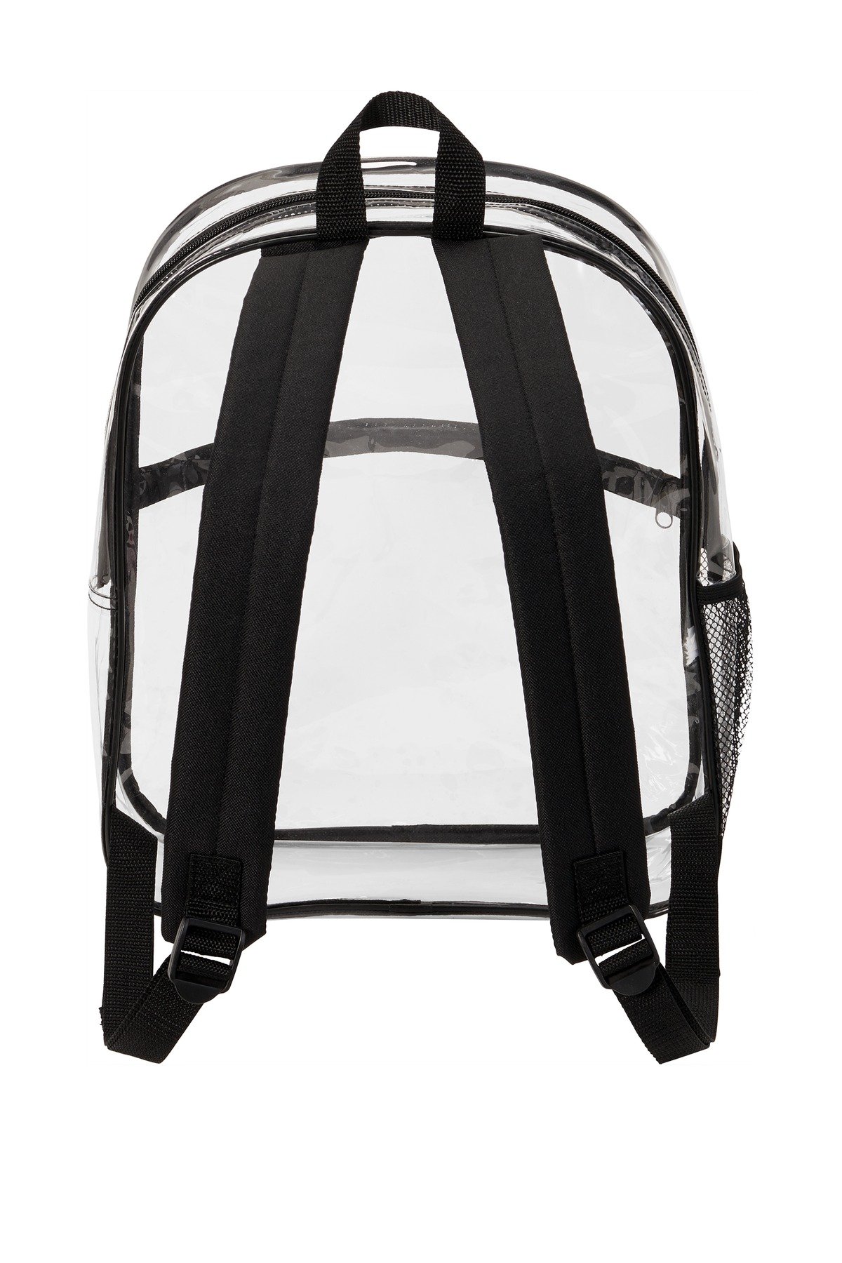 Designed to meet the clear bag policies for stadiums, concerts and events, this pack is also useful in schools, airports and high-security workplaces. Clear PVC Polyester straps and trim Zippered main compartment Zippered front pocket Adjustable, padded shoulder straps Mesh side pocket Dimensions: 15″h x 12″w x 4.25″d; Approx. 765 cubic inches Note: Bags not intended for use by children 12 and under.